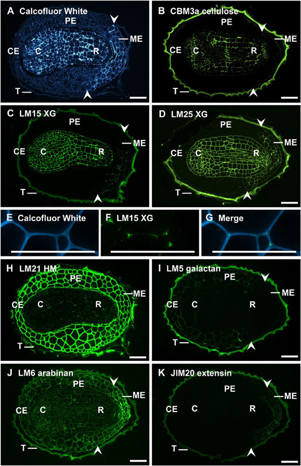 C and D, LM15 XG and LM25 XG epitopes were uniformly distributed in embryo cell walls and restricted to the ME in the endosperm.